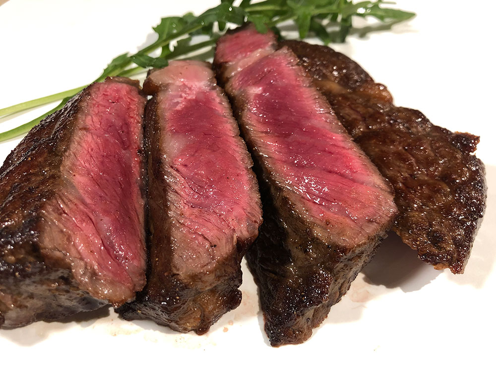 調理方法 | 冷蔵庫で解凍後、まだ冷たい状態のフライパンに、油を敷き肉を載せる。 ①弱火で片面を肉の方向を変えながら、2~3分焼く。肉を裏返して更に2分焼いた後にアルミホイルで包み3分そのまま置く。 ②フライパンを温め、温まったらアルミホイルから肉を取り出して①の焼き方を繰り返す。 肉の表面の真ん中を押して柔らかければ焼き加減はレア気味、軽い弾力が有ればミディアムレアに近い焼き上がりです。 |